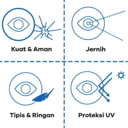 Bahan lensa anti pecah dan dengan perlindungan sinar UV.